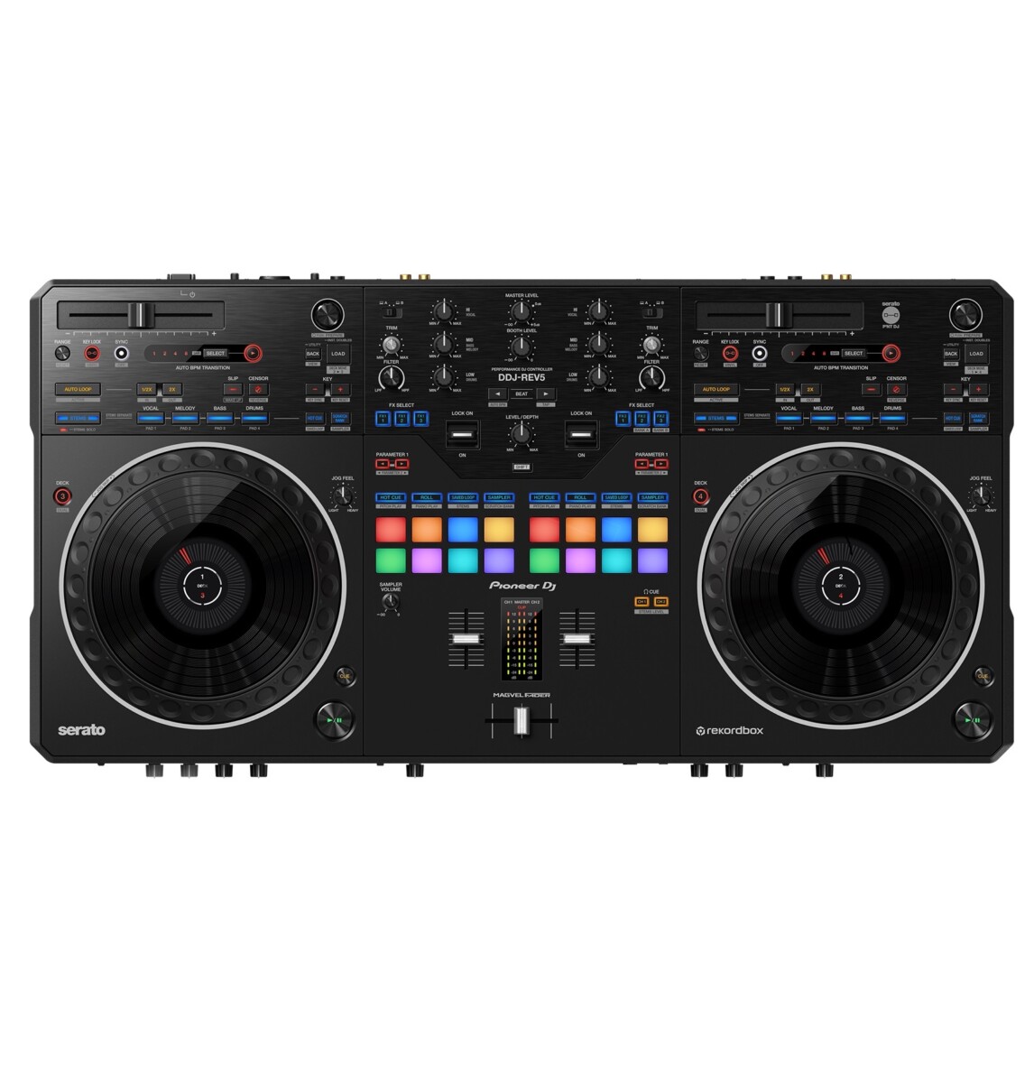 El Pioneer DJ DDJ-REV5 es un controlador de nueva generación compatible con Serato DJ Pro y rekordbox. Esta unidad de 2 canales ofrece una auténtica experiencia de scratch y características innovadoras que incluyen sus grandes jogs, MAGVEL FADER, botones dedicados para el control Stems, la primera transición automática de BPM y el modo Piano Play.