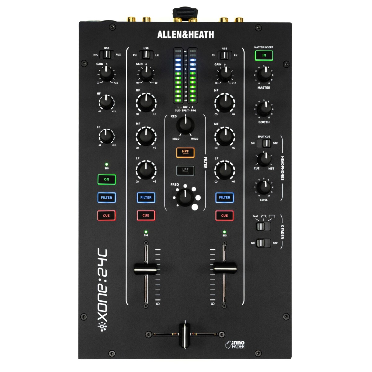 El Xone:24C incorpora el crossfader Mini innoFADER, en el que confían DJs de todo el mundo por su respuesta suave y durabilidad. Interruptores retroiluminados, medición precisa y una completa interfaz de E/S completan este mezclador diseñado para ofrecer un rendimiento fiable, sin importar dónde se encuentre.