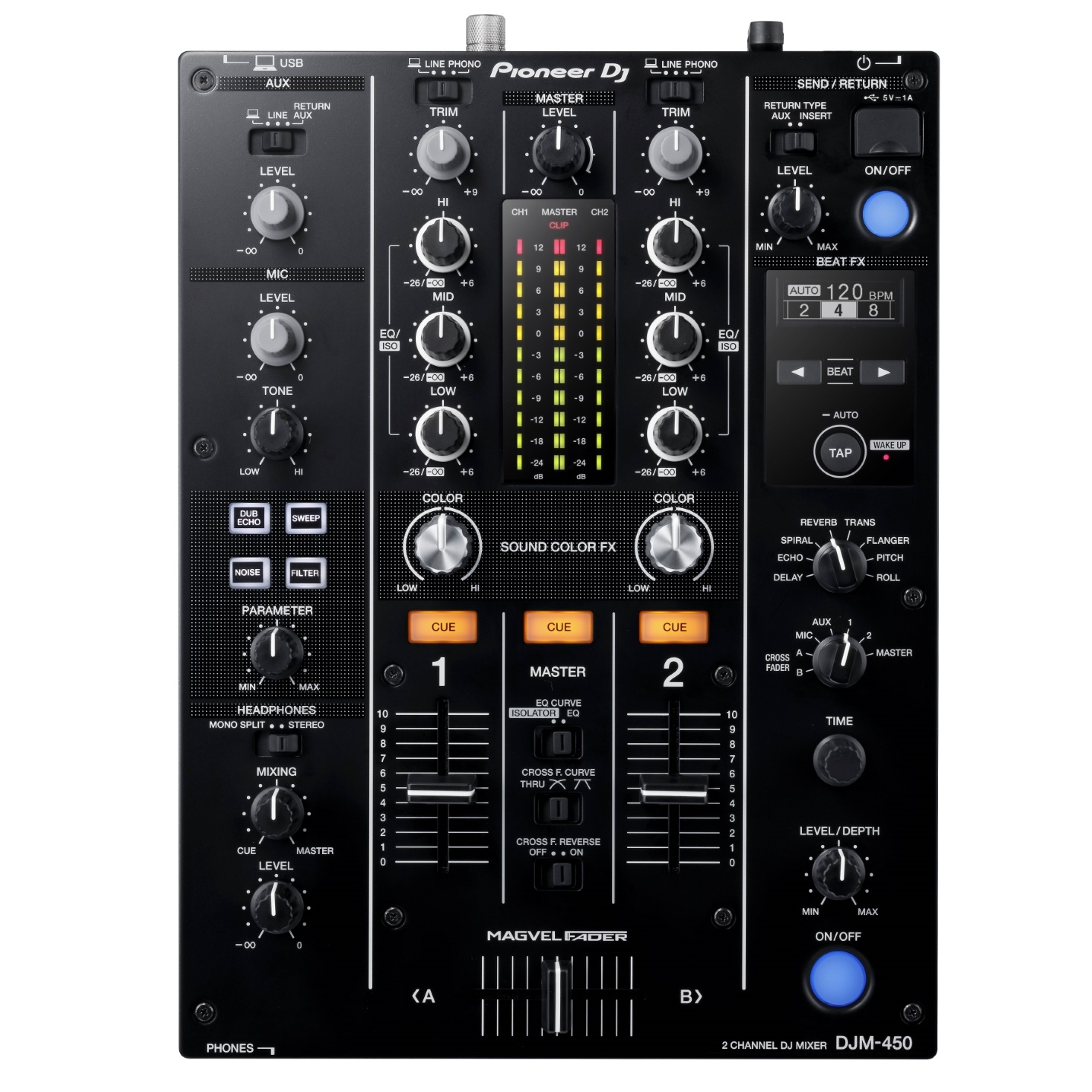 La mesa de mezclas Pioneer DJ DJM-450 es la mesa de mezclas ideal para complementar a los reproductores XDJ-700 o los platos PLX-1000. El crossfader Magvel, el suave EQ y los faders de canal ofrecen una respuesta precisa para que te sientas seguro mezclando. Sound Colour FX y Beat FX tienen control de parámetros.