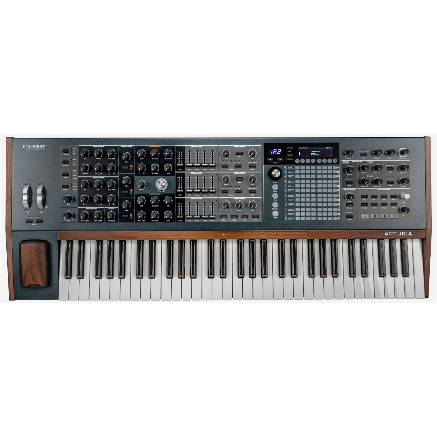 Selección de modos de teclado Poli, Mono o Unison. Revolucionario controlador Morphée de 3 ejes para la expresión táctil en tiempo real. Controlador de cinta asignable encima del teclado. Rueda de pitch y rueda de modulación multifunción asignable. Secuenciador de 64 pasos con grabador de movimiento y automatización.